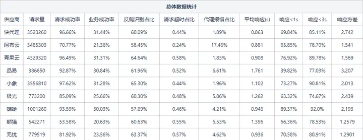 - 请求超时占比:1. 阿布云 2. 快代理 = 小象 3. 蜻蜓